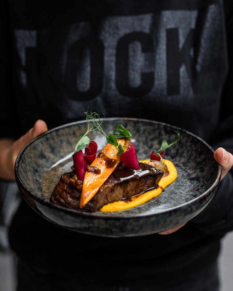Dans notre assiette, des ingrédients utilisés qui se marient parfaitement avec un bel équilibre en bouche. Du poisson (Saint-Pierre) à la viande (Boeuf ou Porc) en passant par des légumes selon la saisonnalité. Baïeta propose une petite pissaladière pour son entrée en scène, un délice visuel et gustatif. Avec cette petit touche niçoise, on retrouve toujours cette envie culinaire de la Méditerranée avec des mets savoureux, légers et frais.
