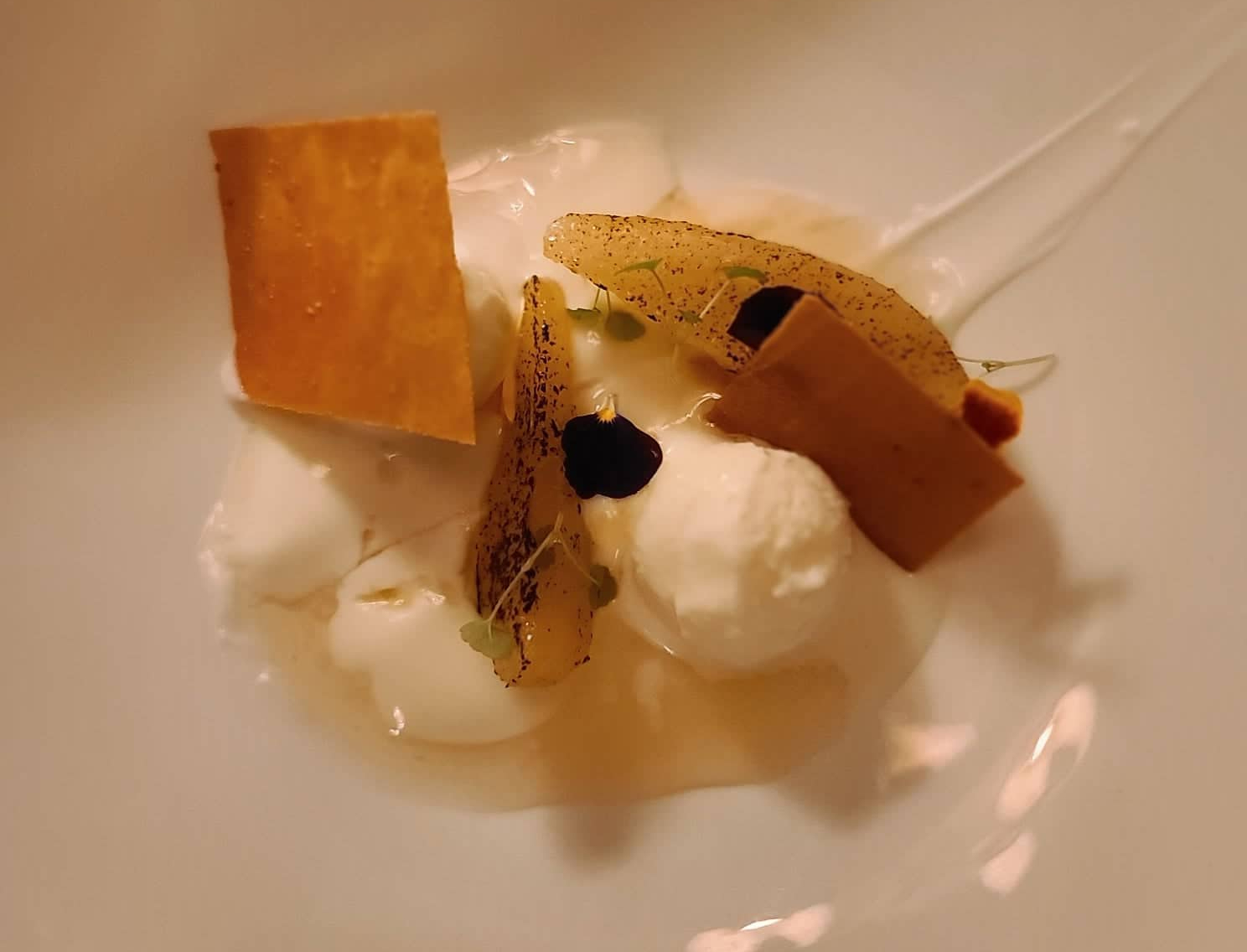 La partie dessert approche à grand pas, pour nous, il était indispensable de découvrir les créations napolitaines du chef. La Poire pochée par exemple et sa glace au yaourt et croquant de Sichuan, miel de Provence.