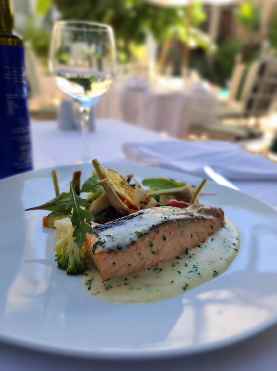 Nous débutons cette expérience avec le plat du jour, son pavé de saumon frais et ses légumes de saison. Un plat parfaitement assaisonné, frais et coloré, doté d’une présentation fine à souhait. La table propose également d’autres mets incontournables tels que la Salade de camembert rôti au miel mesclun de salade, l’Assiette dégustation de salades marocaines & mezze libanais ou encore le Tempura de crevettes parfumé à l’huile d’argan.