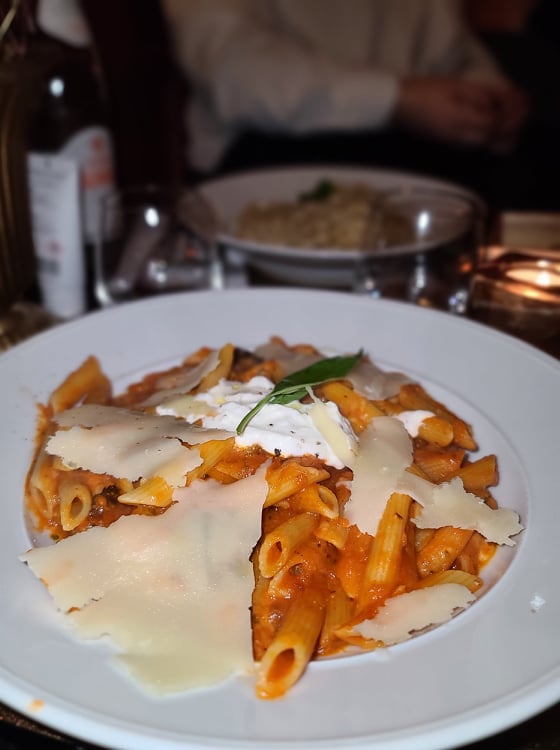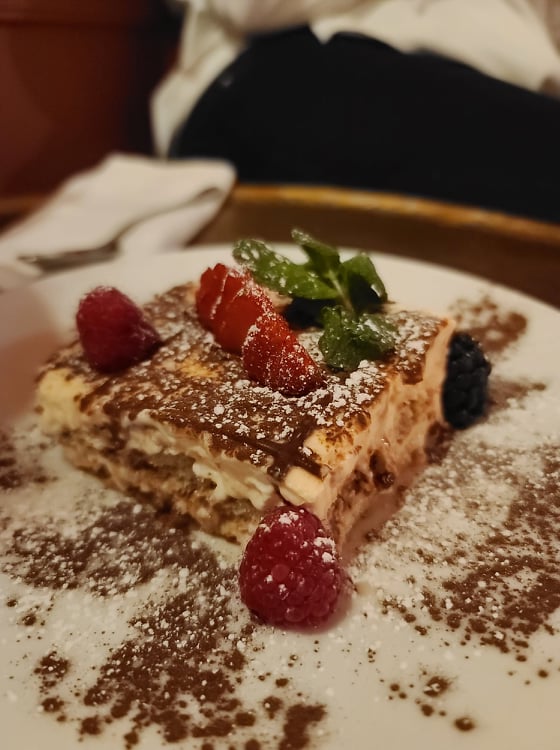 En entrée, des Beignets de mozarella, Burrata di pugliese ou encore des Calamars frits, le dîner se poursuit avec des Penne al norma, ou encore une Pizza typiquement italienne, avant de conclure par la cerise sur le gâteau, un délicieux Tiramisu au café.