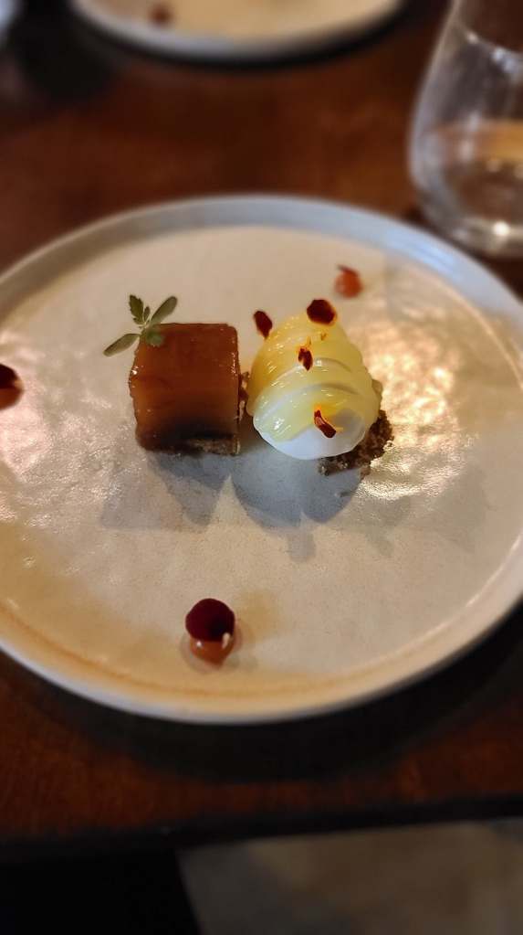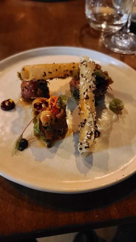 Du côté de la carte, différentes propositions intéressantes sont au programme. Un service à la carte ou une dégustation en plusieurs temps est proposé. Nous avons opté pour un menu à la carte. Les festivités commencent avec le Tartare de Boeuf Coréen, condiment sésame noir et tuile de pain. Une alliance franco/coréenne délicieuse qui nous fait voyager avec panache.
