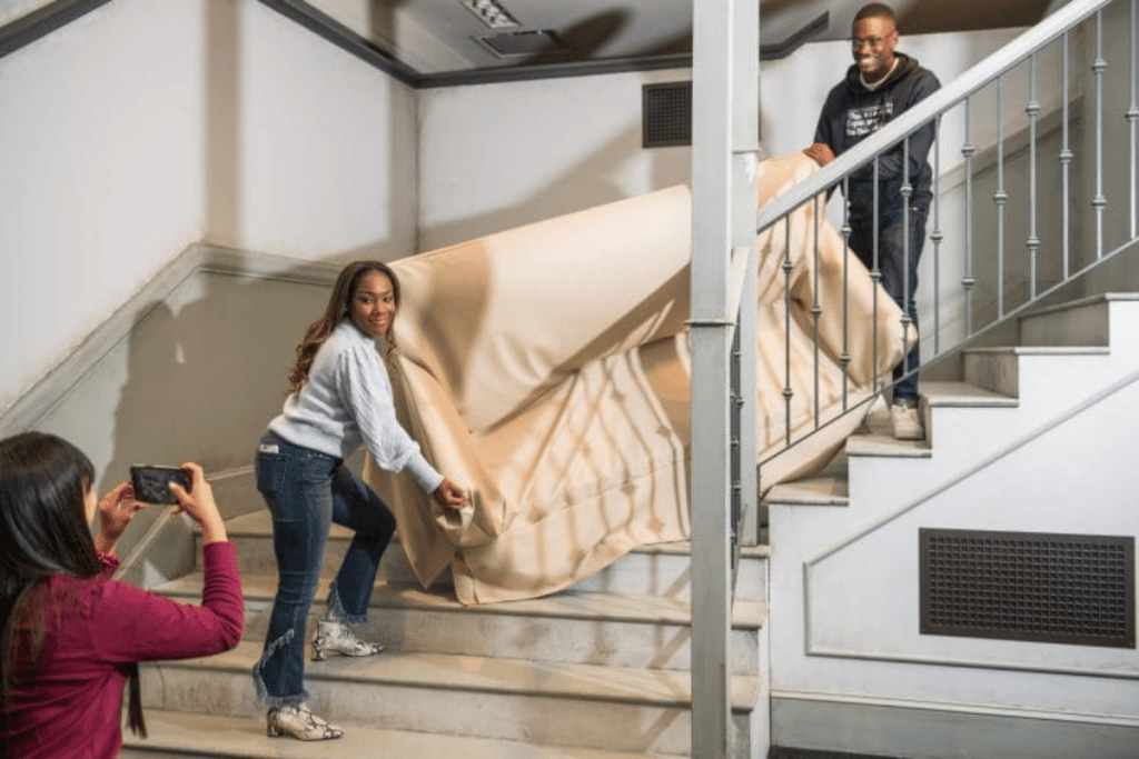 Ensuite, nous poursuivons la visite. Nous avons eu la chance de reproduire l’une des scènes les plus cultes de la série : Le déménagement et son canapé dans les escaliers avec un certain pivot technique mémorable. Avec des reconstitutions plus vraies que natures, nous rentrons au coeur de la séquence avec un petit souvenir photographique.