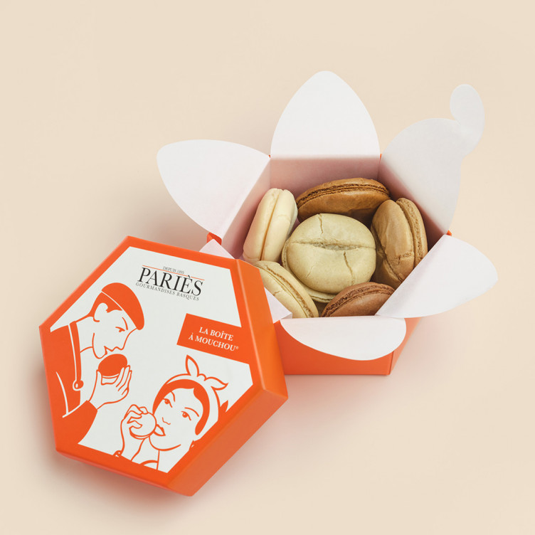 Terminons notre présentation avec la Boîte de 15 Mouchou assortis, qui nous a permis de (re)découvrir les 5 parfums phares de la Maison Pariés : nature – amande, pistache, chocolat, café et noisette. Croquants et fondants, le Mouchou est une gourmandise assez originale dans son aspect similaire au macaron.