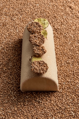 La bûche Sarrasin Tatin propose quand à elle un subtil équilibre lié aux côtés un peu aphrodisiaque et fruité par la pomme et les épices. En effet, la crème au sarrasin est délicatement travaillé pour s’accorder comme il faut à la dégustation. La fraîcheur et l’exotisme contrebalance en une mousse et une gelée aux fruits que l’on garde en bouche avec engouement.