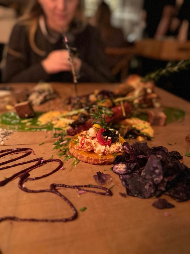 Le menu sophistiqué et à l’aveugle qui tourne autour des 50 euros, gourmand à souhait, se composait ainsi d’un Beurre de Noël aux truffes & champignons de saison, Karaage de chou-fleur et sa fameuse sauce tartare, une succéssion de propositions colorés, délicats et savoureux : des Beignets de topinambours, mayonnaise, carottes violettes épicées, Champignons portobello snackés, clémentines en brunoise, câpres, pickles de chou rouge, oignons rouges.