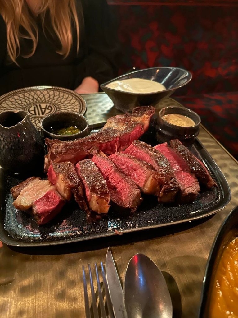Pour la suite, nous avons eu le choix, des plats individuels ou à partager, nous avons donc opté pour le partage et la fameuse Côte de boeuf Angus. Un Boeuf Angus rôti à la flamme devant nous, sa sauce vierge à l’huile d’argan et poivrons et son jus de viande aux épices douces. Un plat à partager pour 2 ou 3 personnes.