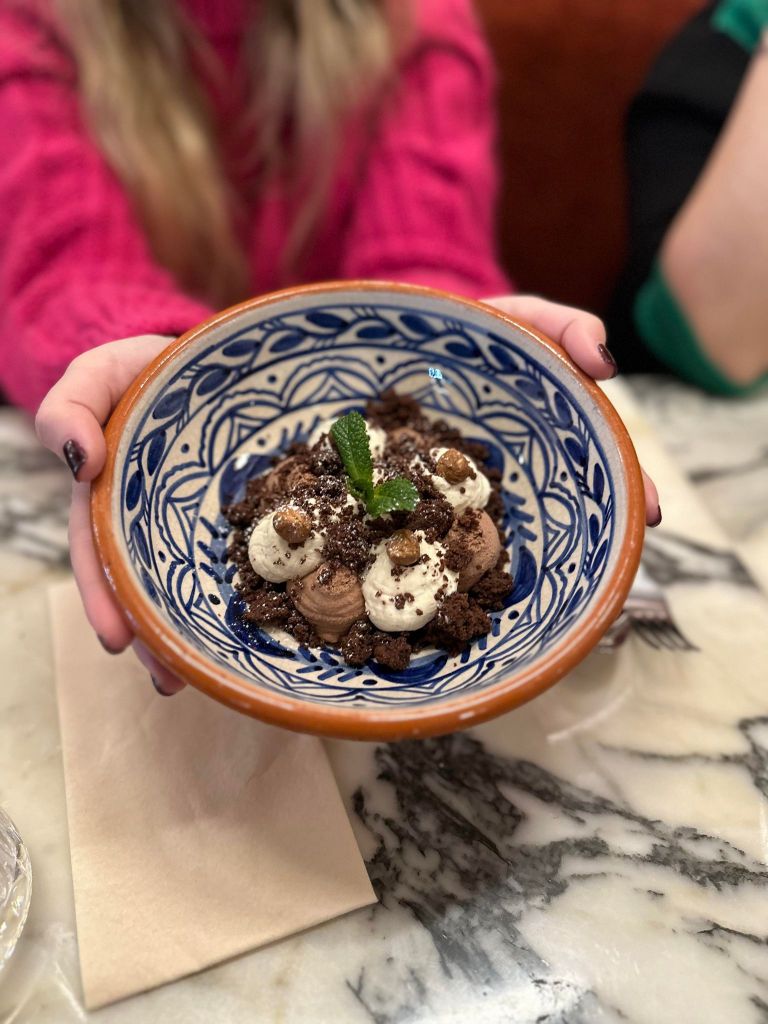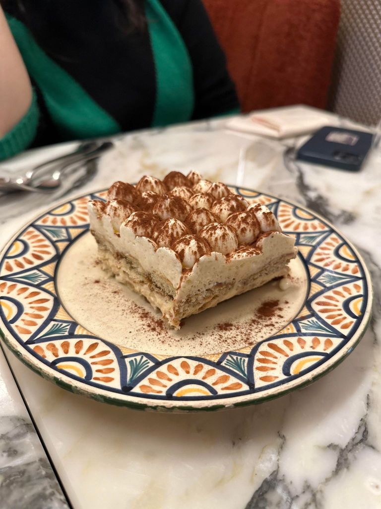 Impossible de clôturer ce déjeuner sans terminer sur du sucrée, Agata propose justement des mets sucrées alléchants. Nous choisissons deux desserts iconiques, le Tiramisu et sa crème de mascarpone, biscuit savoiardi, espresso, amaretto et son cacao et le Kosmic cioccolato, une mousse chocolat Valrhona 66%, ganache noisette piémontaise et biscuit au chocolat.