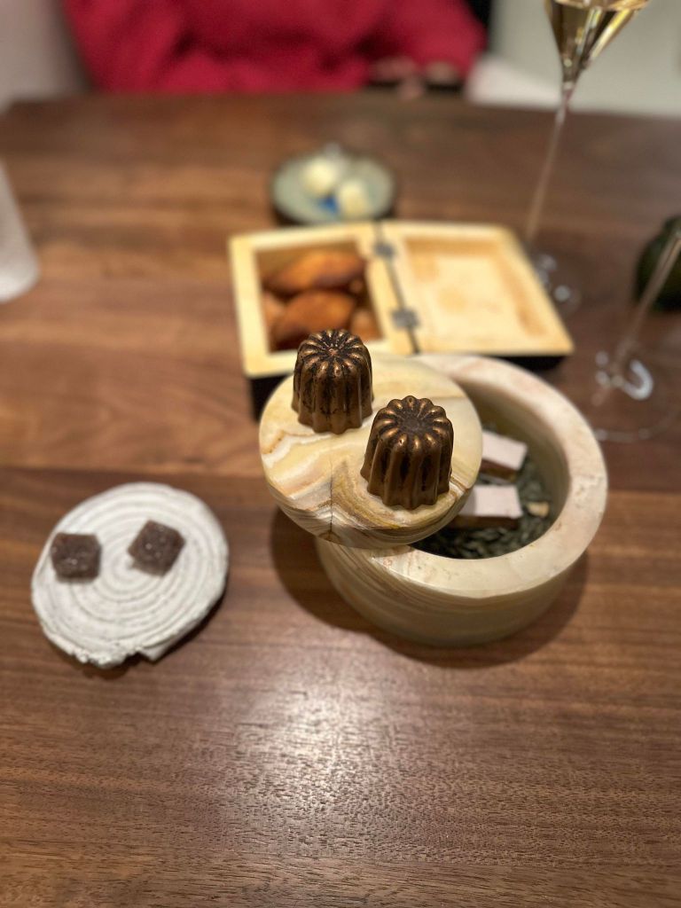 Bien entendu, on peut accompagner son menu de divers mets qui seront servis entre les plats. Mise en bouche, pré-entrée, pré-dessert, mignardises, autant de mets qui entrent dans le rituel d’un menu gastronomique. Plus qu’un simple dîner, c’est une projection qui s’interprète à table, dont chaque créations suit son propre acheminement.