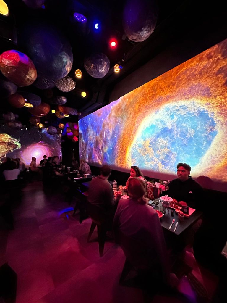 La décoration interstellaire fait son petit effet, il s’agit d’un lieu très instagramable ou nous garderons des souvenirs mémorables. L’adresse parisienne s’articule sur deux étages avec des projections aux murs de planètes, selon les saisons, un élément qui fonctionne relativement bien. Le client est conquis.