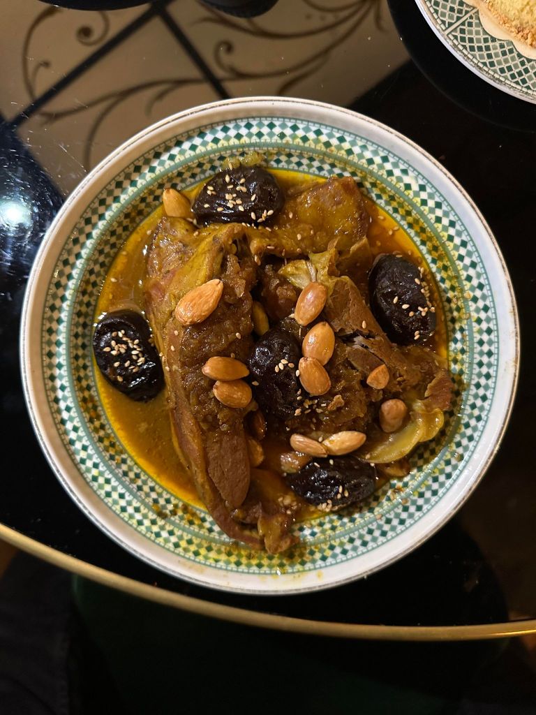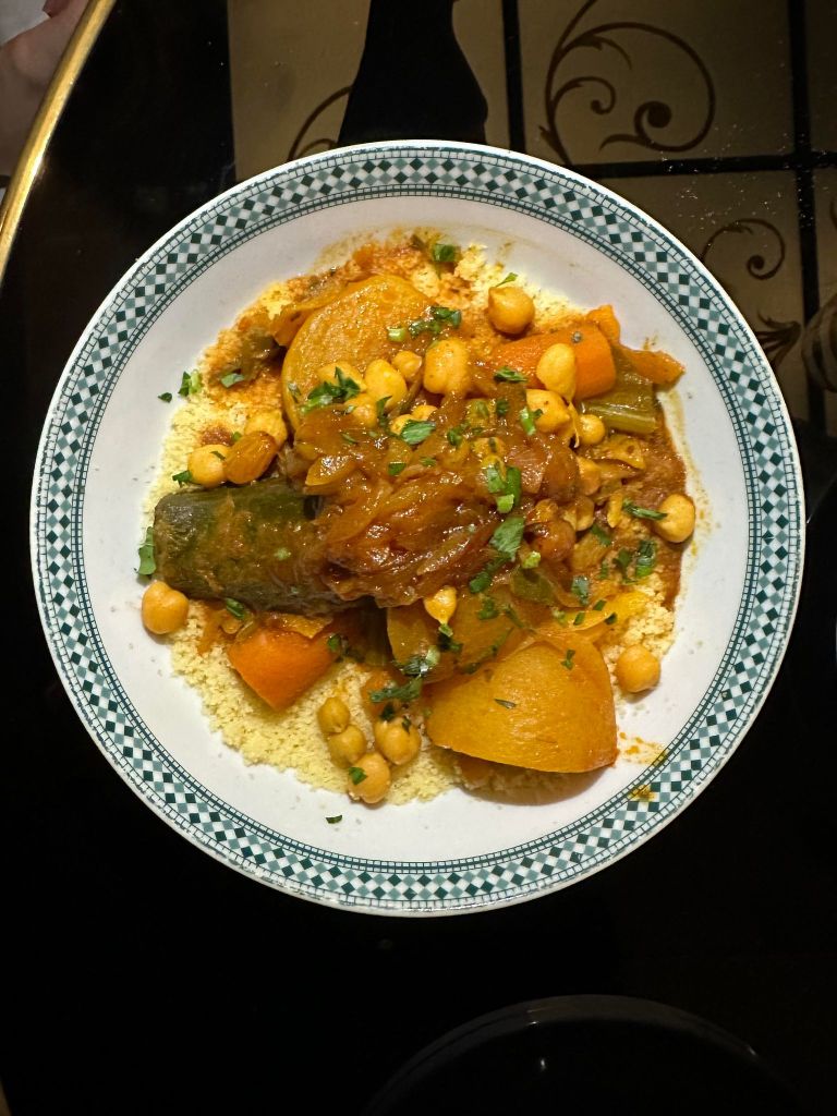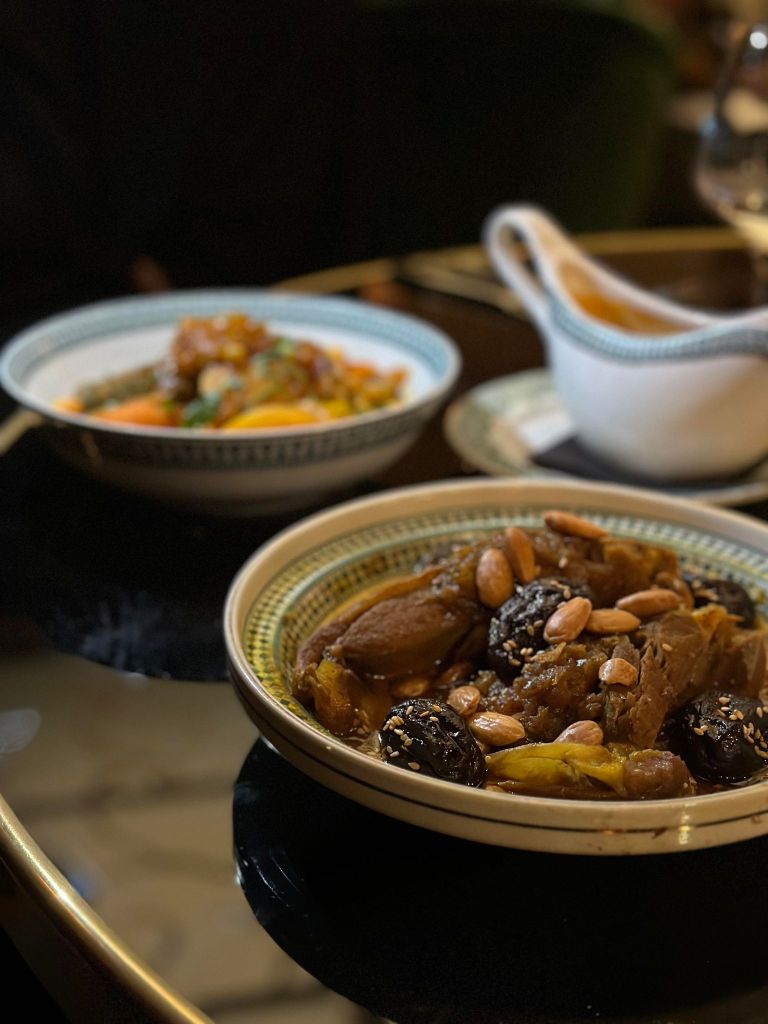 Nous ne sommes pas déçu, les plats déroulent des parfums exceptionnels et un visuel très gourmand. Le Tajine d’agneau aux pruneaux, amandes et seffa nous transporte avec ferveur, la viande est cuite à merveille, l’association sucré/salé est bien exécuté, c’est un sans faute. Le Couscous végétarien aux 7 légumes va égaler s’assurer d’être parfaitement assaisonné, coloré et bien cuit.