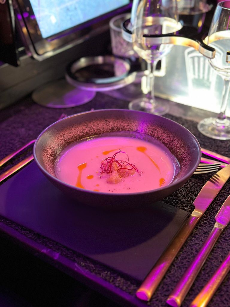 Lors de ce dîner, entre deux plats, nous avons eu le plaisir de découvrir l’histoire de Paris grâce à une application unique et un guide audiovisuel disponible en 6 langues avec 96 points d’intérêts sur chaque table. A deux pas de la Tour Eiffel, nous profitons de plusieurs entrées réconfortantes, la Crème de panais légèrement fumé, infusion au citron et croûtons à l’huile d’olive ainsi que la Ballotine de saumon de Norvège aux baies roses, sauce grelette.