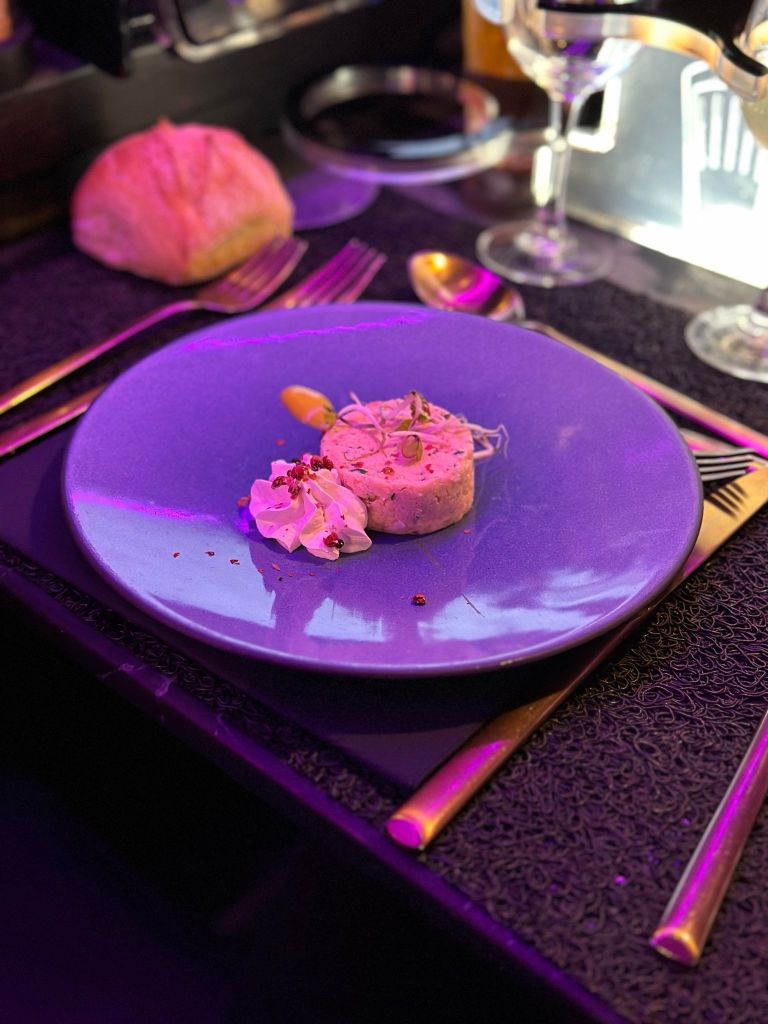 C’est avec passion que nous découvrons les éclairages de Paris, cette ville lumière si parfaite, en choisissant de rouler dans la féérie du diner bistronomique proposé par le Bus Toqué. Le rendez-vous est donné au 67 Avenue des Champs Elysées, puis, vous êtes accueillis cordialement par l’équipe du bus. Grâce aux larges vitres du bus, nous avons pu prendre le temps d’apprécier la vue parisienne face à un apéritif raffiné du chef.