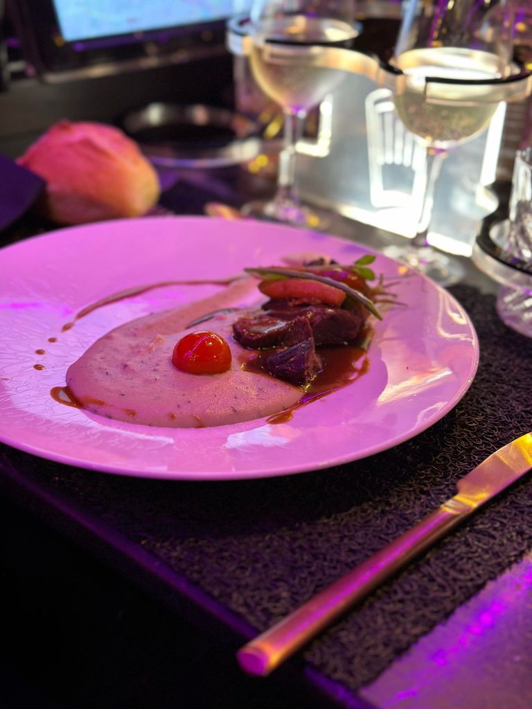 Pour le plat, c’est face à Notre dame que nous apprécierons le Rôti de noix de bœuf Limousin aux épices du chef (sauge et romarin), purée de pommes de terre parfumée à la truffe, légumes du moment et son jus de viande. Un moment hors du temps pour une viande tendre et savoureuse en bouche.