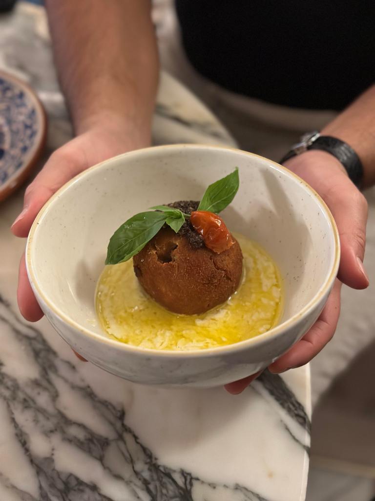 Nous décidons d’entamer cette dégustation par des entrées de qualité, des Arancino Cacio e Pepe, la fameuse boule de riz frit au pecorino romano fondu et poivre avec sa crème de pecorino, crème de truffe et tomate semi-confite. Un moment culinaire suspendu.