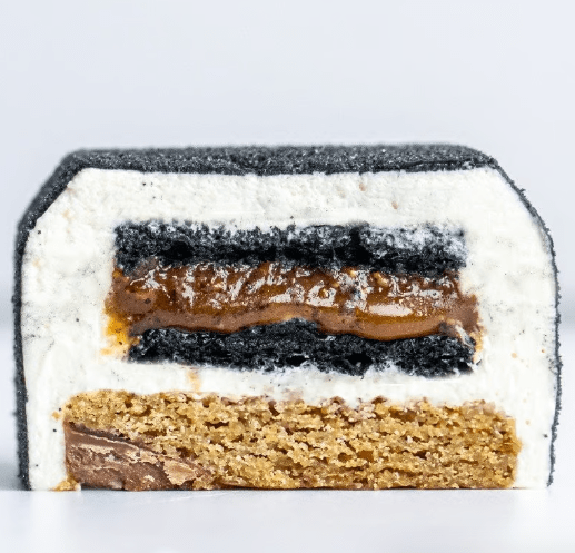 Le tout est sublimé par une ganache montée à la vanille de Papouasie et recouvert d’un flocage au chocolat blanc, beurre de cacao, et charbon végétal. Un dessert élégant et raffiné qui offre un véritable travail d’orfèvre.