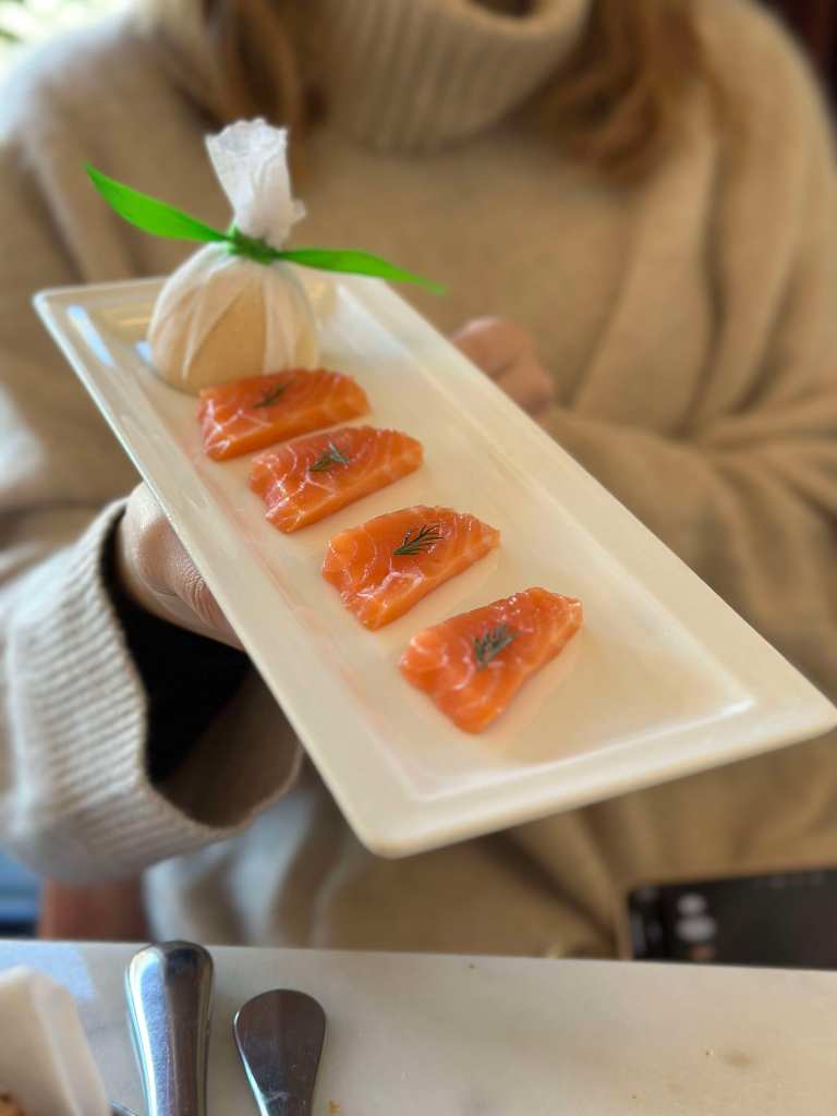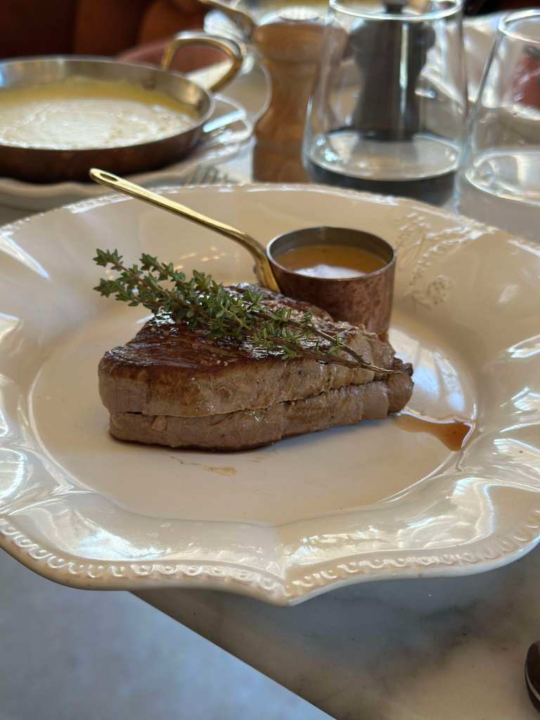 Nous avons opté pour l’Avocat gambas blacktiger, une produit frais qui se déguste avec enthousiasme, un premier élément parfait pour débuter ce déjeuner. La bavette d’aloyau Angus qui fait la différence, ce plat est à la fois délicat, gourmand et moderne, on y apprécie le visuel et son gout en bouche.