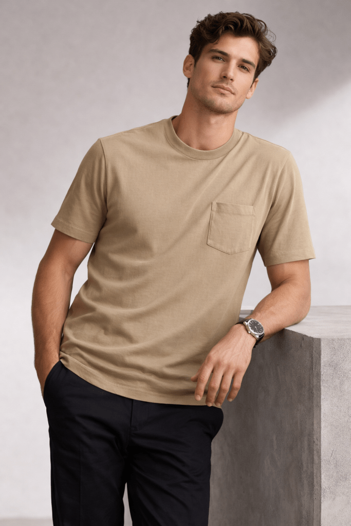 Dans une collection d’automne/hiver, le T-shirt Gabin pourrait sembler un choix inattendu… jusqu’à ce qu’on l’essaie. Son tissu premium, plus épais qu’un t-shirt ordinaire, en fait un sous-vêtement parfait sous un pull ou une veste. Mais il a aussi assez de personnalité pour être porté seul, grâce à sa coupe impeccable et son tombé naturel.