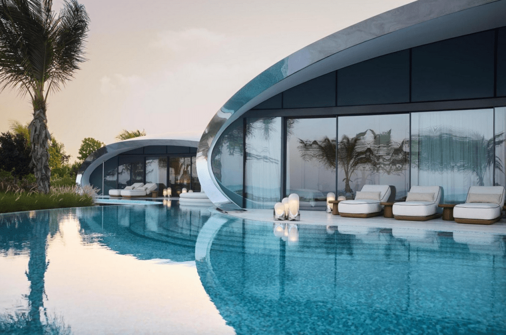 Selon l’heure, le resort change d’identité. À l’aube, il est presque invisible. À midi, il se confond avec le bleu. Au crépuscule, il devient lumière.
