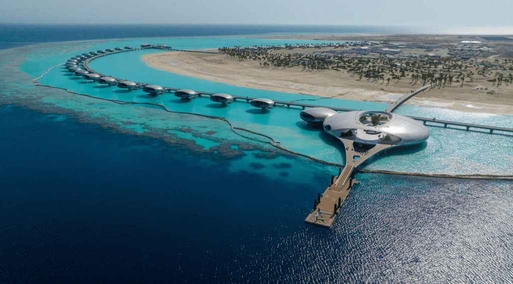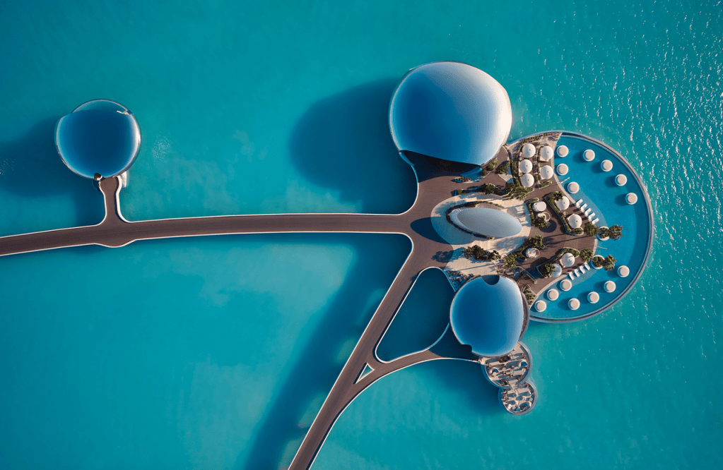À mesure que l’embarcation s’approche, l’horizon se fragmente en reflets mouvants. Des formes circulaires émergent lentement de la mer Rouge, comme si elles avaient toujours été là, dissimulées par la lumière. L’architecture ne s’impose pas au paysage : elle s’y dissout. À cet instant précis, une certitude s’installe — Shebara n’est pas un lieu que l’on visite, mais un état que l’on traverse.