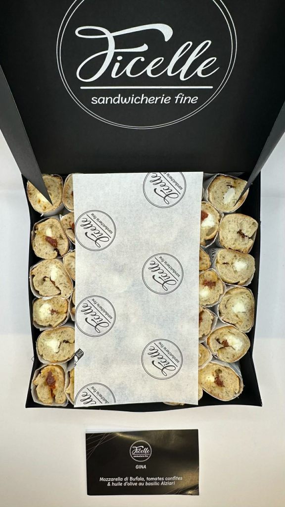 Là où Ficelle se distingue véritablement, c’est dans sa relecture du traiteur à travers ses boîtes élégantes de pièces cocktail et mini-sandwichs. Ce format mérite qu’on s’y attarde, car il redéfinit les codes du secteur.